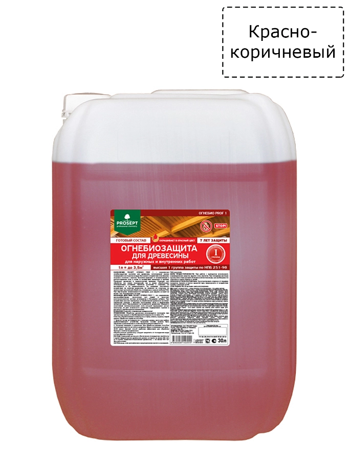 НАЗНАЧЕНИЕ: PROSEPT ОГНЕБИО PROF 1 – комплексная огнебиозащитная пропитка для древесины, используемой внутри помещений и на открытом воздухе без прямого воздействия атмосферных осадков и контакта с грунтом. Пропитка защищает древесину от возникновения и распространения огня, а также от воздействия биологических агентов (дереворазрушающие грибки, насекомые и их личинки). Переводит древесину в трудногорючий материал - I (высшая) группа огнезащитной эффективности по НПБ 251-99 и II группа огнезащиты по НПБ 251-98 при меньшем расходе - 500 г/м² и 300 г/м² соответственно. Подходит для обработки как новых конструкций, так и конструкций, ранее обработанных огнезащитными составами. Огнебиозащитная пропитка устойчива к старению, не высаливается и не выщелачивается, легко покрывается любыми ЛКМ. Состав не оказывает негативного воздействия на свойства древесины, не изменяет ее структуру, существенно не изменяет естественного цвета древесины (базовая модификация А, модификация Б содержит краситель для контроля нанесения), не препятствует дальнейшей обработке, склеиванию и окраске. Гарантированный срок защиты - не менее 7 лет. Подтверждено тестами.