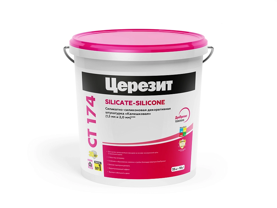 ПодробнееШтукатурка декоративная силикатно-силиконовая Церезит СТ 174 камешковая 2 мм база 25 кг