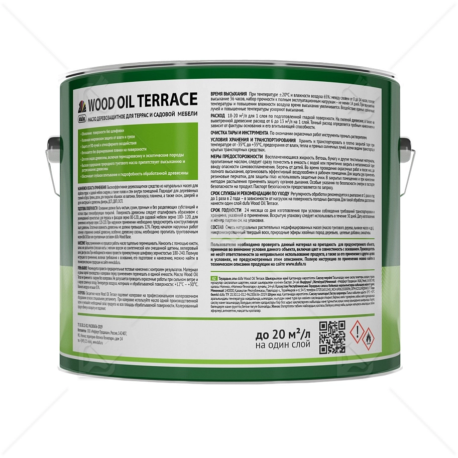 разных партий производства и колеровки перед применением перемешать в единой емкости. Масло düfa Wood Oil Terrace не применяется снаружи без колеровки. Не допускается проводить окрасочные работы при сильном ветре и в жаркую солнечную погоду. Температура воздуха, материала и объекта: +12⁰С – +30⁰С. Влажность воздуха не выше 85%. Санитарное промасливание проводить с периодичностью один раз в год.